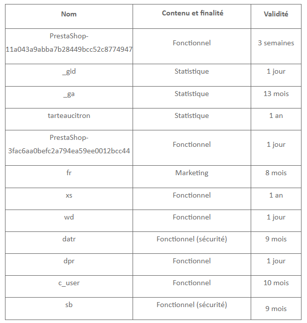 Certains cookies assurent le fonctionnement correct de certaines parties du site Internet et la prise en compte de vos préférences en tant qu’utilisateur. En plaçant des cookies fonctionnels, nous vous facilitons la visite de notre site Internet. Ainsi, vous n’avez par exemple pas à saisir les mêmes informations chaque fois que vous visitez notre site Internet et il est possible, entre autres, que les articles de votre panier y soient conservés jusqu’à votre paiement. Nous pouvons placer ces cookies sans votre consentement.